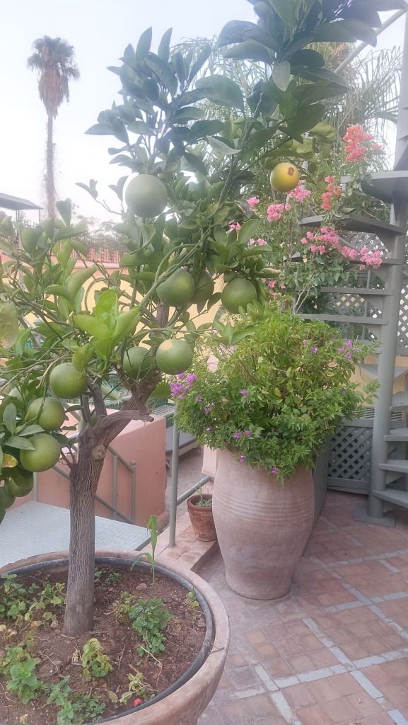 Riads are the homes once lived in by the well-to-do of Marrakech. They are built around a central courtyard and have various citrus trees and foliage in the middle, reaching up through the open rooftop.