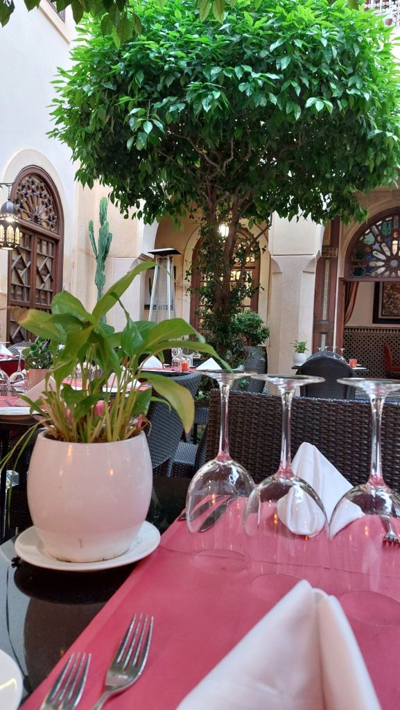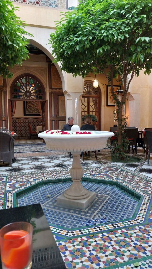 The setting is absolutely stunning, with a pretty courtyard surrounded by beautiful foliage and gentle trickling fountains.